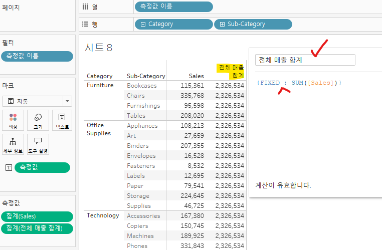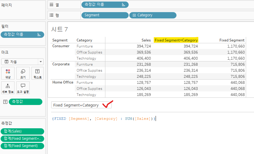 현재 Sales 칼럼의 값처럼, 측정값인 Sales 변수는 차원인 Segment/Category에 따라 집계되는 것이 기본 작동 방식이다. 하지만 LOD 표현식인 FIXED를 사용하여 Segment 기준으로 매출 합계를 집계했기 때문에 값이 서로 다른 것이다. 즉, 현재 View에 상관없이 특정 차원을 사용하여 계산하였다.