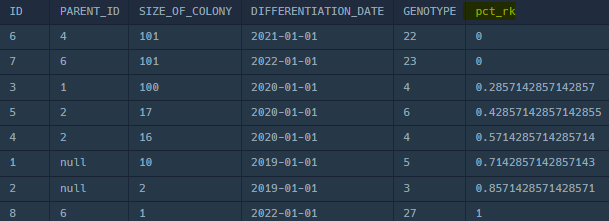 , PERCENT_RANK() OVER (ORDER BY size_of_colony DESC) AS pct_rk
