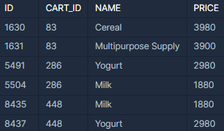 하지만, 이 문제를 해결하기 위해서는 cart_id별 name 칼럼 값을 연결해줘야 한다. 즉, 서로 다른 두 칼럼 값이 아닌 하나의 컬럼의 여러 값을 연결하는 목적을 갖는다.
