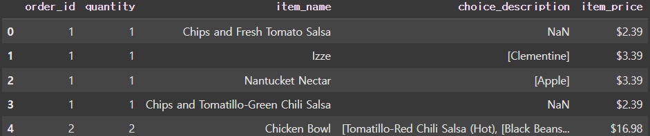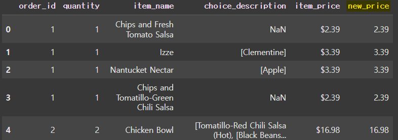 'item_price' 컬럼의 달러 표시 문자를 제거하고 float 타입으로 저장하여 새로운 'new_price' 컬럼 가공