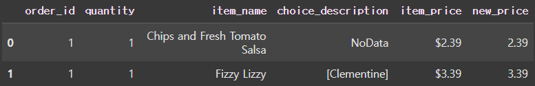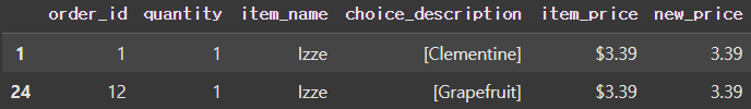 ✔️df의 데이터 중 아래와 같이 item_name 값이 'Izze'인 데이터를 'Fizzy Lizzy'로 변경하고자 한다.