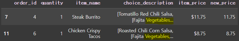 ✔️ df의 데이터 중 choice_description 값에 Vegetables 단어가 들어가지 않는 데이터를 조회하고자 한다.