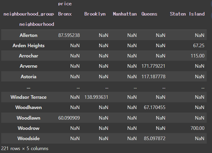 'neighbourhood_group' 값이 컬럼으로 이동한 것을 확인할 수 있으며 shape 또한 (221, 1)에서 (221, 5)으로 변환됨을 알 수 있다.