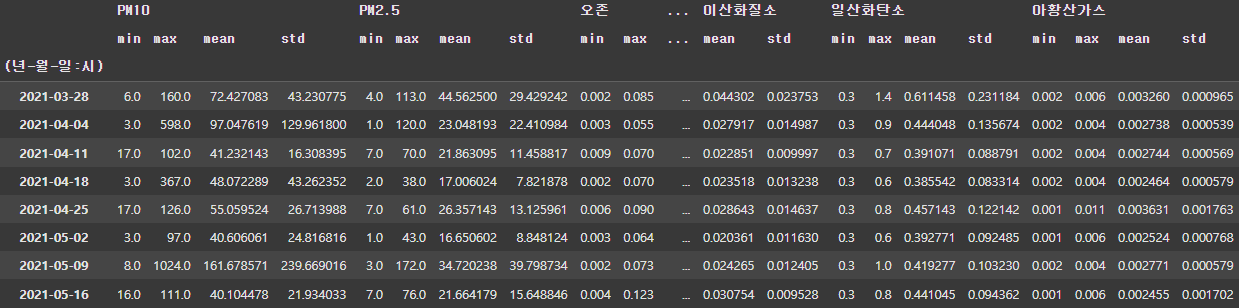 df.set_index('(년-월-일:시)').select_dtypes(exclude=['object']).resample('W').agg(['min', 'max', 'mean', 'std'])