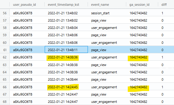 왼쪽 : 기존 세션 ID인 'ga_session_id' 컬럼을 보면 10분이 넘지만 30분을 넘지 않는 경우에 같은 세션 ID를 갖고 있다.