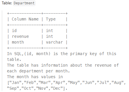 ✅ 제공 테이블의 id, month, revenue 데이터를 가지고, 각 month를 열로 변환하여 revenue 데이터를 각 열에 맞게 매핑해야 하는 문제이다.