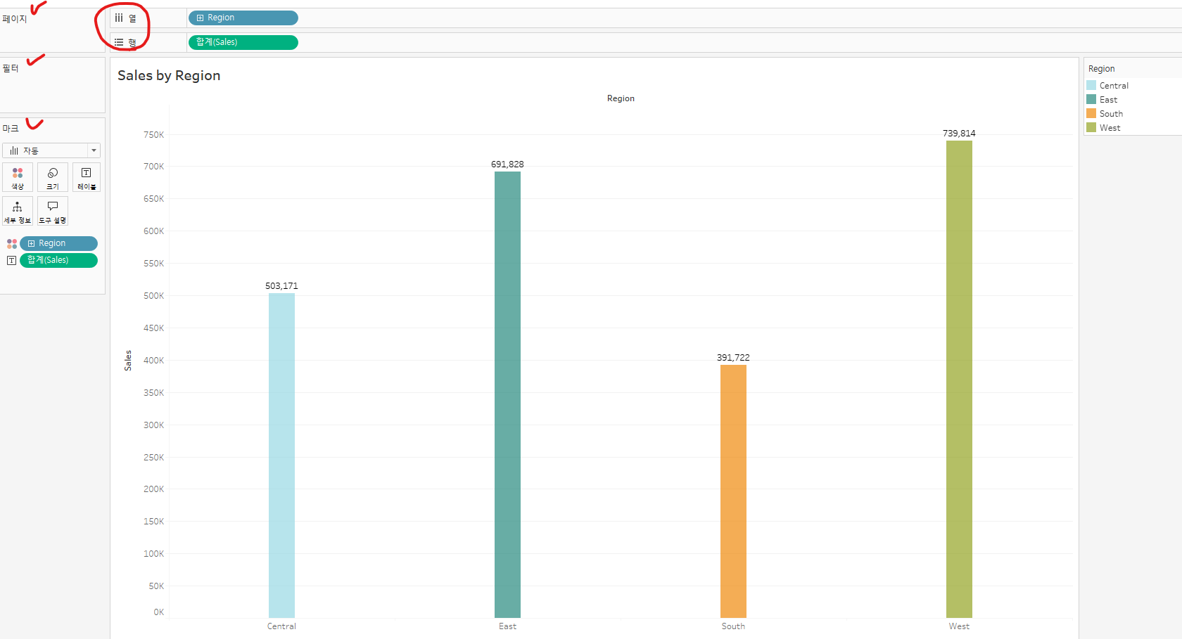 빨간 표시된 부분에 차원이 추가되면 시각화의 세부 수준, 즉 측정값의 집계 기준이 결정된다. 위 시각화 자료는 Region(지역) 변수별 Sales(매출) 변수의 합계를 집계한 것이다.