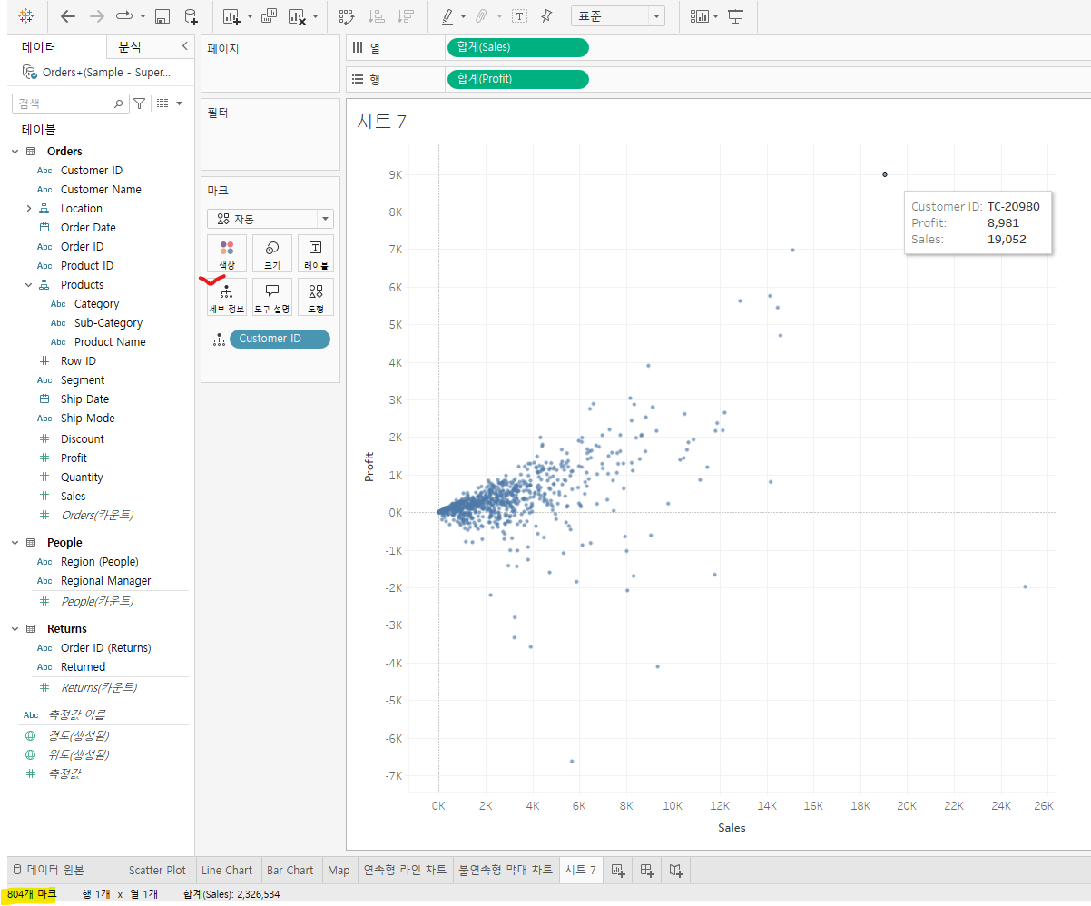태블로는 차원으로 데이터를 세부적으로 쪼갠다. 따라서 세부정보에 Customer ID 변수를 넣으면 고객별 매출 및 이익을 집계할 수 있다. 측정값을 자르는 기준이 생겼기 때문이다.