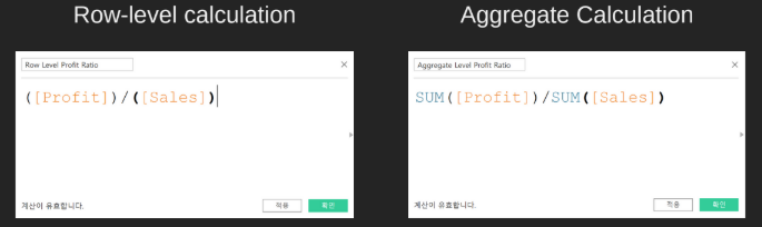 ✅Aggregate Calculation 방법이 정확하다. 행 단위 계산(왼쪽)은 각 행을 기준으로 profit/sales 연산을 수행하고 값을 더하지만, 집계된 계산(오른쪽)은 각 측정값의 합계를 집계한 후에 나누기 때문이다.