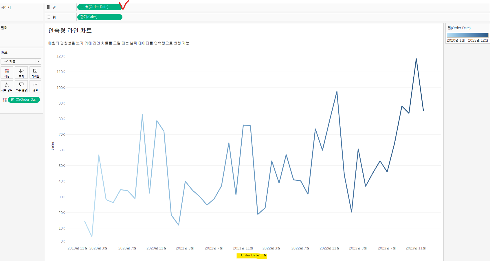 이번에는 연속형으로 설정했기 때문에 월별 매출 합계가 쭉 이어진 것을 확인할 수 있다. 또한 연속형은 순서를 바꿀 수 없기 때문에 정렬이 불가능하며, 불연속형과 달리 해당 변수가 축(Axis)에 위치한다.