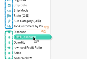 태블로 워크시트의 좌측 패널을 보면 선이 존재한다. 이 선을 기준으로 차원은 파란색이고 측정값은 초록색이라고 착각할 수 있지만, 그렇지 않다. 불연속형이 파란색이고 연속형이 초록색이다.