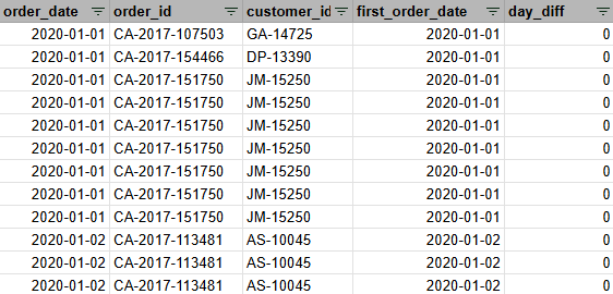 주문 데이터와 고객 데이터를 조인하여 각 고객의 주문일과 첫 주문일 차이(일수)를 계산 - 최종 select :