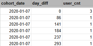 cohort_date와 day_diff를 기준으로 고유 고객 수를 집계