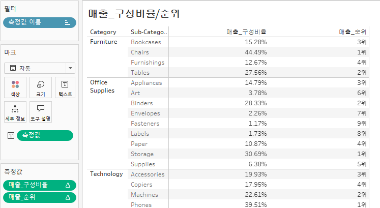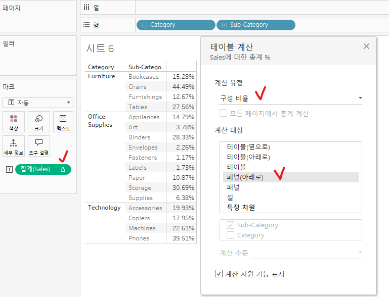 ✅ 마크선반에 있는 Sales 변수 우클릭 > 테이블 계산 클릭 > 구성 비율 및 패널(아래로) 설정